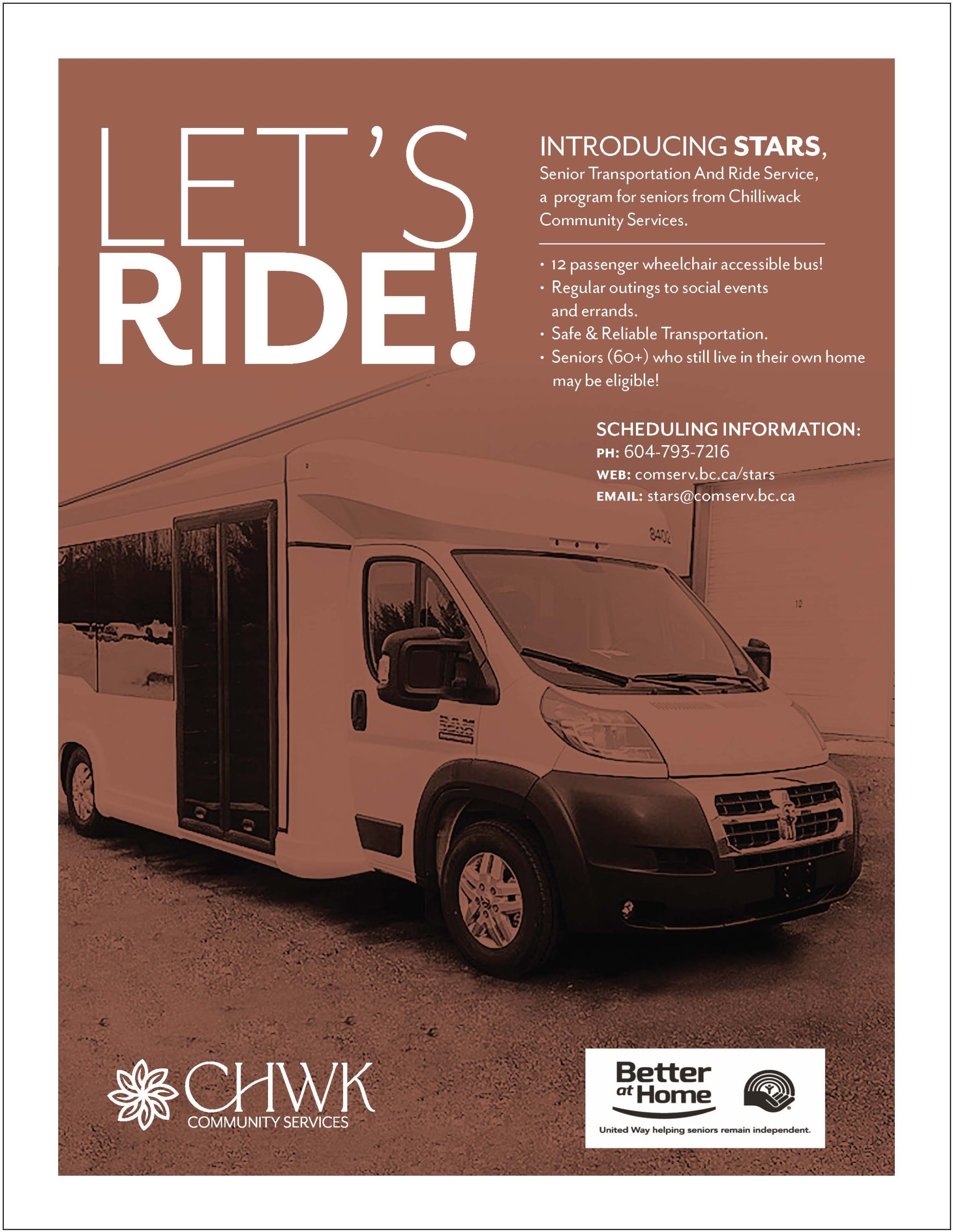 STARS features a 12-person, wheelchair accessible, shuttle bus with a professional driver, for seniors who are 60+ and live in Chilliwack. The goal of the program is to assist seniors in staying in their own home for as long as possible by providing safe, reliable transportation. Currently, we offer rides to Abbotsford appointments, social outings and grocery stores. STARS is not considered an essential service.